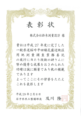 平成27年度に完了した「一般県道桜峠平田線花露辺地区用地測量調査業務委託」について、岩手県県土整備部長 及川隆様より表彰いただきました。