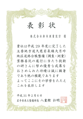 平成29年度に完了した「主要地方道久慈岩泉線大月峠地区道路台帳整備(調査・測量)業務委託」について、岩手県県土整備部長 八重樫弘明様より表彰いただきました。