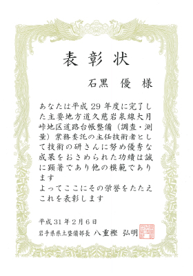 平成29年度に完了した「主要地方道久慈岩泉線大月峠地区道路台帳整備(調査・測量)業務委託」で主任技術者を務めた弊社社員「石黒 優」について、岩手県県土整備部長 八重樫弘明様より表彰いただきました。